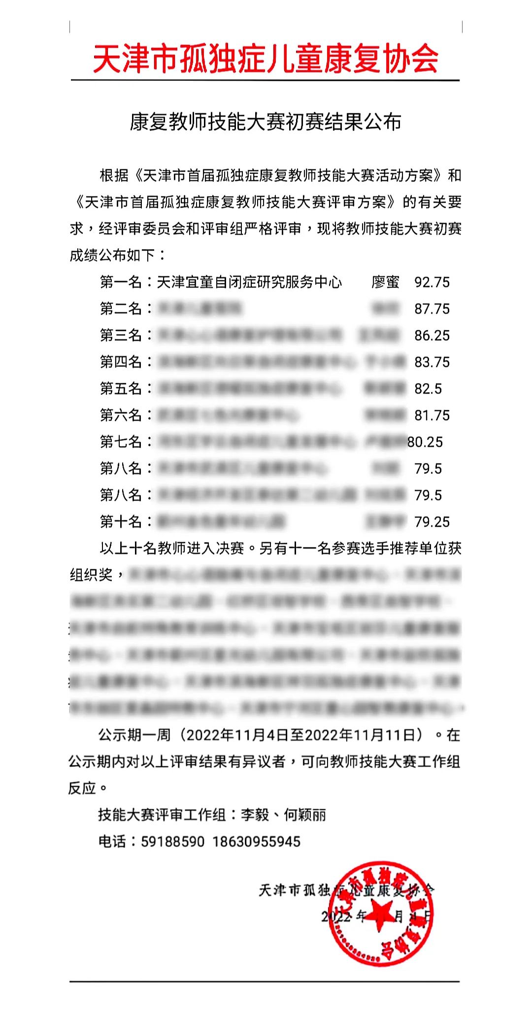 在由天津市孤独症儿童康复协会举办的康复教师技能大赛中,天津宜童廖蜜老师以92.75分、超出第二名五分的优异成绩,获得初赛第一名,预祝廖蜜老师在接下来的决赛中再创佳绩!!!