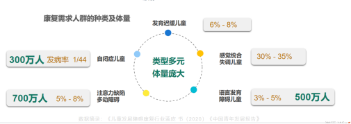 《儿童发展障碍康复行业蓝皮书(2020)》首次报告:根据2-8 岁发展障碍儿童发病率推算出,2-8 岁孤独症谱系障碍的患者估计约 300万人,注意力缺陷多动障碍 患者估计约 700万人,言语语言障碍患者估计约有 500万人。而国内现有儿童康复机构约 3000家,儿童康复师保守估计 10万名, 患儿:康复师 =150:1,处于严重供需失衡。市场需求拉动下行业的规模化及集约化加剧,面对儿童康 复巨大供需差异,国家主导性、兜底性政策加码,以及 2030 年全面建设共同富裕社会的大目标指引下,十四五期间的行业高速发展是必然趋势。