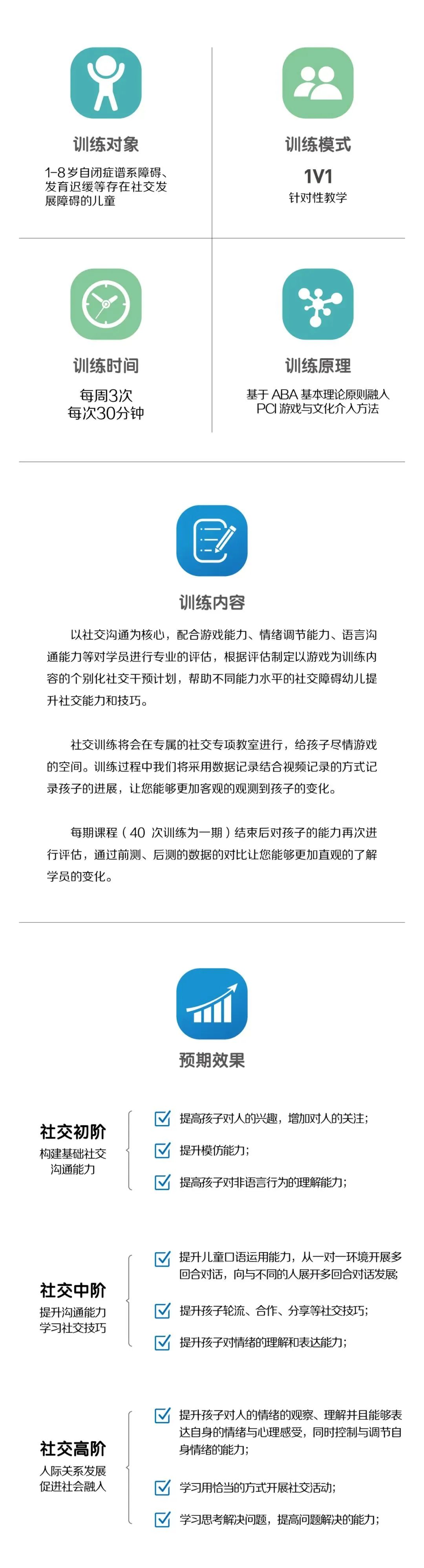 针对自闭症谱系小朋友的核心障碍,宜童核心教研团队,历时两年的研发和近一年的内训模拟,为孩子们推出了全新的“社交专项训练”,帮助不同能力水平的小朋友,提升社交技能,促进普教融入和社会融入。