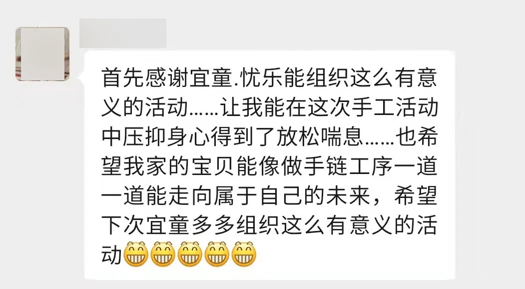 “所以本月,宜童特别联合岳阳忧乐心智障碍者家长互助中心为家长们组织了插花、芳香疗愈和金工手链制作三等场喘息日活动。鲜花、芳香和美丽的饰物都代表了女性的美好,我们也希望通过这些与美同行的活动,让家长们能从焦虑的心情中短暂的抽离,找回曾经美丽的自己。就像忧乐互助中心所倡导的,家长走出去,孩子才会有未来。在这几场活动中我们看到家长脸上绽放的笑容是平时不容易看到的,岳阳宜童也会在接下来的日子里多组织这类的活动,我们不仅要为孩子提供高质量的康复服务,也希望能够为家长提供更多的支持。”